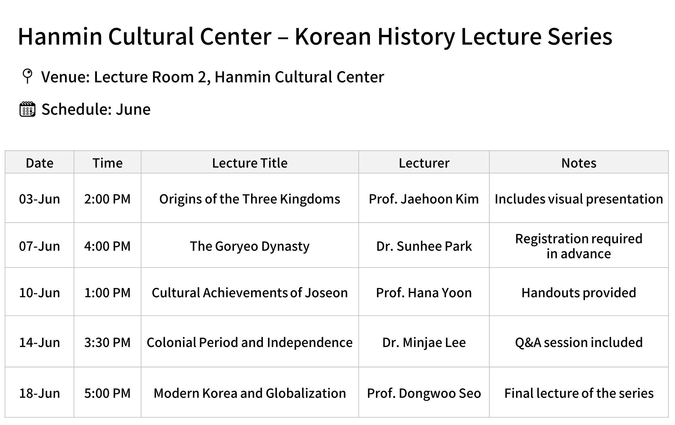 - I recommend the Origins of the Three Kingdoms lecture on June 3rd at 2:00 p.m., presented by Prof. Jaehoon Kim, which includes a visual presentation. Another option is the Colonial Period and Independence lecture on June 14th at 3:30 p.m., led by Dr. Minjae Lee, which includes a Q&A session.
