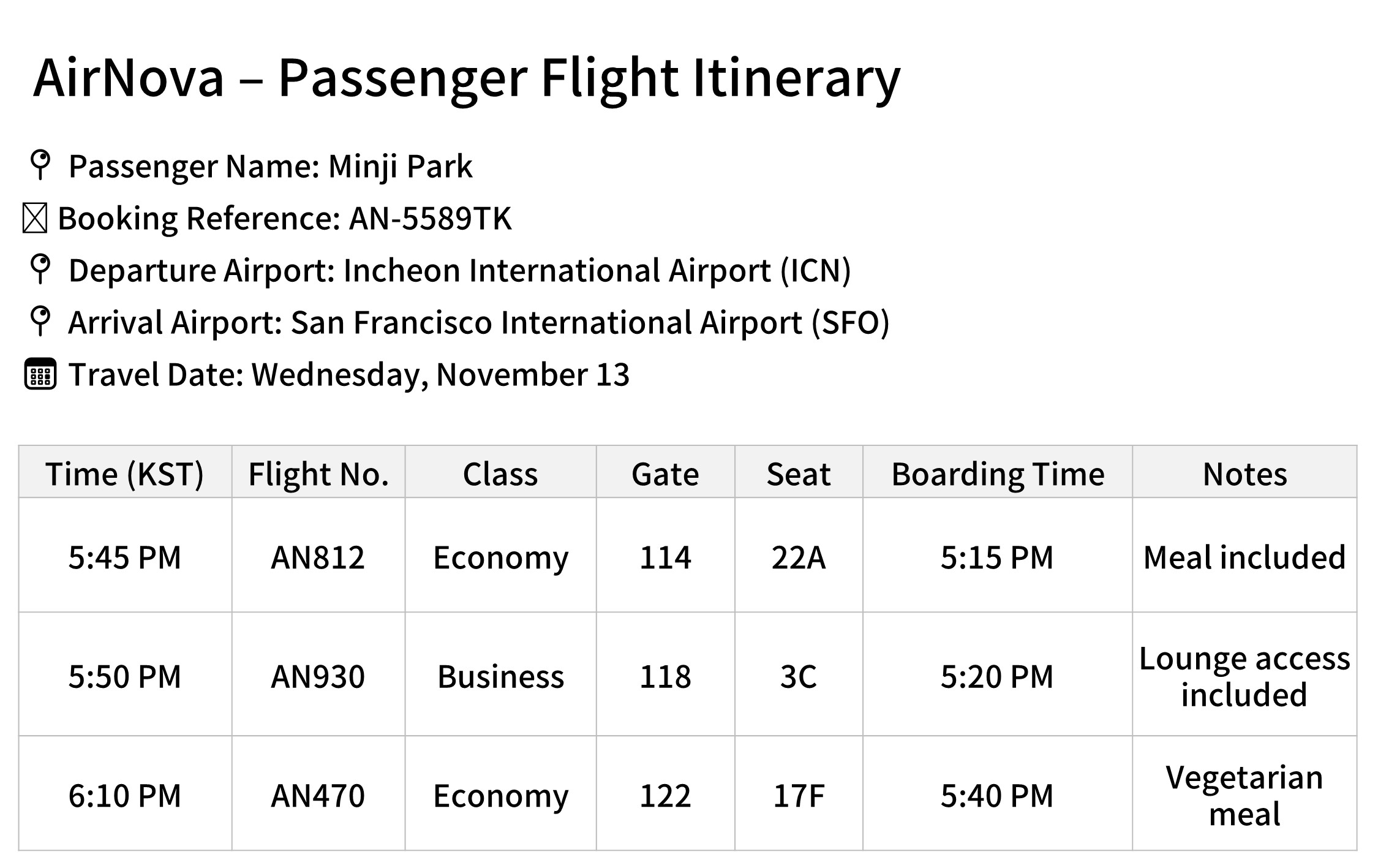 → [항공편 번호], [좌석 번호]로 탑승하며 [식사/서비스]를 이용할 수 있습니다.
